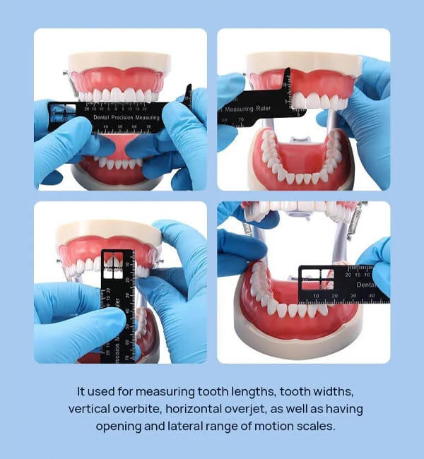 Se utiliza para medir la longitud de los dientes, el ancho de los dientes, la sobremordida vertical, el resalte horizontal, además de tener escalas de apertura y rango de movimiento lateral.